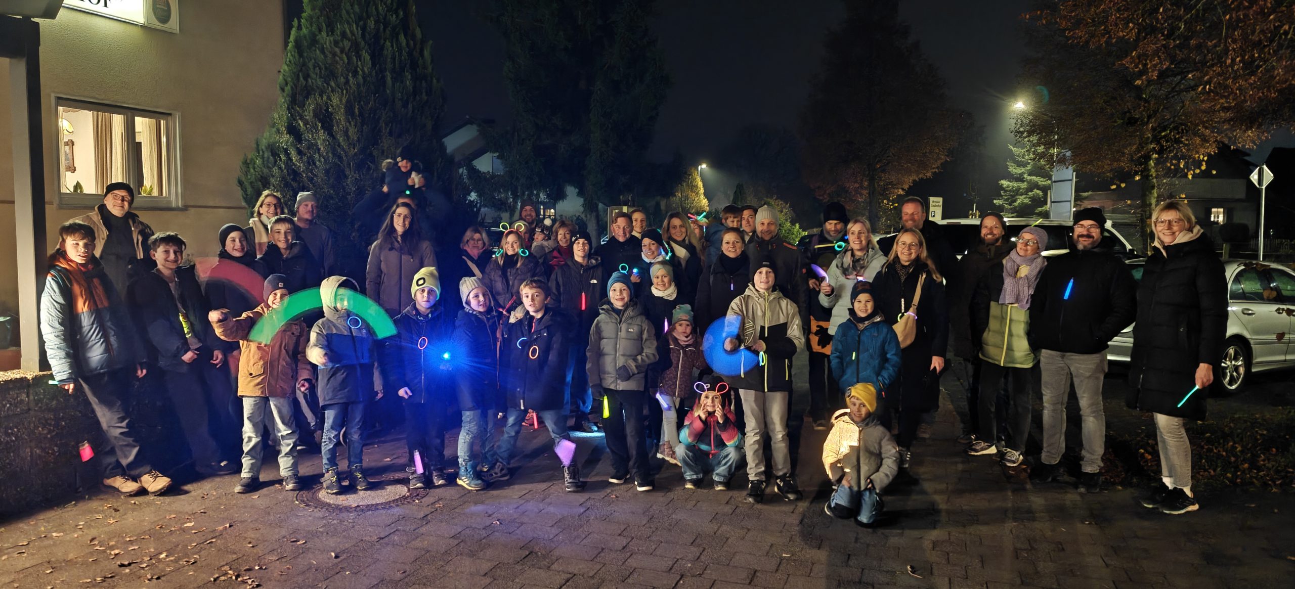 Der Startpunkt war wie auch das Ziel der Wanderung der Parkplatz am Lindenhof in Keulos. Pünktlich um 17:00 Uhr, bei einsetzender Dämmerung, wurden die bunten Knicklichter geknickt und zum Leuchten gebracht. Überall funkelten Farben – ein wunderschöner Anblick und der perfekte Beginn für den Abend. 🌙💡